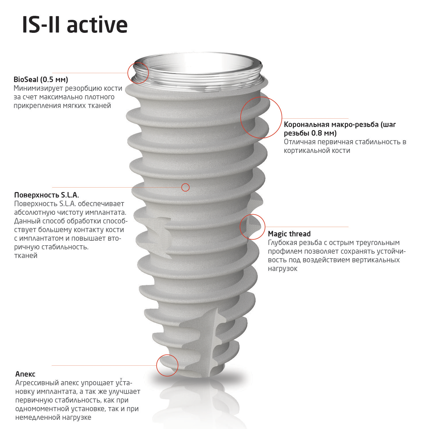 IS-II Active. Флагманская линейка продуктов. Предназначена для одно- и двухэтапной установки. Основные плюсы: поверхность SLA (позволяет сократить срок лечения за счет ускорения процесса остеоинтеграции), фиксация CMI (повышает стабильность импланта), функция Bio-Seal (минимизирует атрофию кости за счет плотного прилегания мягких тканей), технология Magic Thread (уникальная резьба, позволяющая винту выдерживать высокую горизонтальную и вертикальную нагрузку).