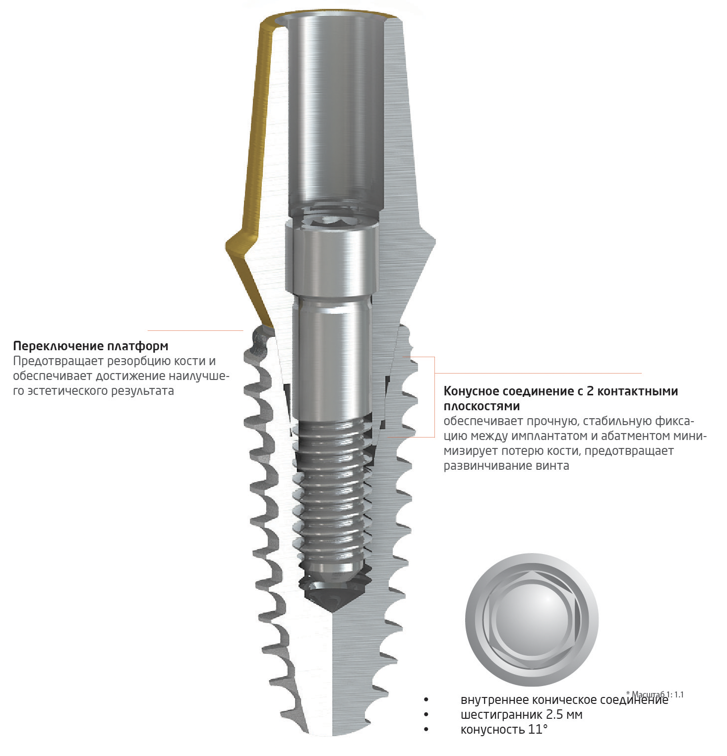 Функция Bio-Seal. Заключается в увеличении контакта импланта с мягкими тканями. Для этого на шейку титанового корня наносится микрорезьба, позволяющая достичь биологической ширины в 1 мм на сечении в 0,5 мм. Эта функция минимизирует потерю костной массы и улучшает эстетический результат реставрации.